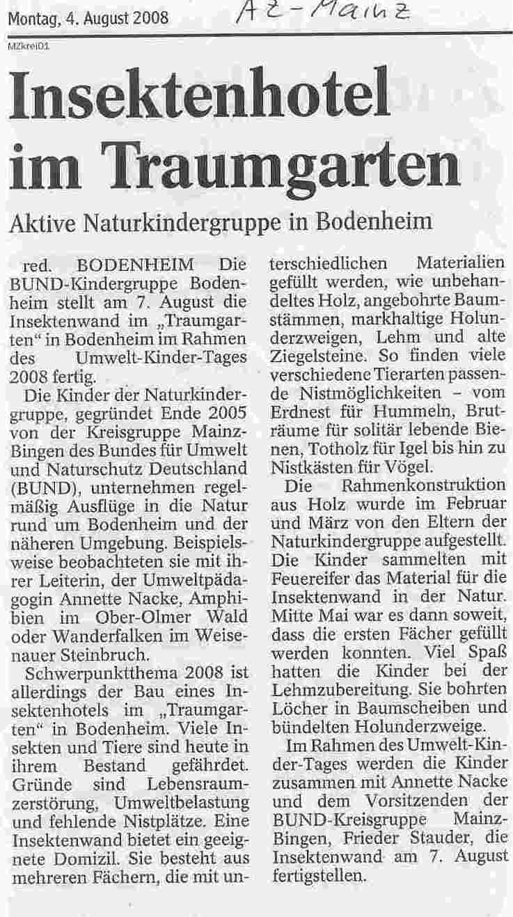 Kreisgruppe Mainz-Bingenaus: Allgemeine Zeitung Mainz vom 4.8.2008von: red.Insektenhotel im TraumgartenAktive Naturkindergruppe in Bodenheim