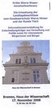BUND Kreis HöxterDie Umsetzung der Landtagsbeschlüsse zum Gewässerschutz Werra/Weser und der Runde TischDritte Werra-Weser Anrainerkonferenz in BremenAm 17. November 2008 fand die dritte Werra-Weser Anrainerkonferenz (WWA) im Haus der Wissenschaft in Bremen statt. Eingeladen hatten der Bremer Senator für Umwelt, Bau, Verkehr und Europa als Schirmherr sowie der Verein Werra-Weser Anrainerkonferenz. Die Informationsveranstaltung richtet sich an Entscheidungsträger aus Verwaltung und Politik sowie an interessierte Bürgerinnen und Bürger. Seit Anfang 2006 werden Fragen der Versalzung von Werra und Weser durch Abwässer der Kaliindustrie erneut und verstärkt diskutiert. In diese Diskussion haben die Landtage von Hessen und Thüringen mit Beschlüssen eingegriffen, welche die Bildung eines Runden Tisches vorsahen, die aber auch deutlich darüber hinaus gingen. Die Landtage von Niedersachsen und Nordrhein-Westfalen haben sich mit ähnlicher Zielrichtung angeschlossen. Seit der Konstituierung des Runden Tisches im März 2008 konzentriert sich die Aufmerksamkeit auf dessen Arbeitsergebnisse; die Erwartungen sind hoch. Kürzlich hat das Verwaltungsgericht Kassel angeregt, ein anhängiges Verwaltungsstreitverfahren um die stattfindenden, aber kontroversen Salzeinleitungen und die Auslegung der EG-Wasserrahmenrichtlinie ruhen zu lassen, bis der Runde Tisch seine Arbeitsergebnisse vorgelegt hat. Nach Auffassung des Gerichts könne eine Entscheidung sogar hinfällig werden, falls der Runde Tisch „eine für alle Beteiligten befriedigende Lösung finde“. Damit hat der Runde Tisch eine Bedeutung erlangt, die es notwendig macht, seine Arbeitsweise einer kritischen Würdigung zu unterziehen. Seine Aufgabe, nämlich „Vertrauen und Akzeptanz zu schaffen und tragfähige Lösungsvorschläge zu entwickeln“, wird der Runde Tisch nur erfüllen können, wenn Vertrauen und Akzeptanz nicht auf eine Mehrheit der am Runden Tisch Beteiligten beschränkt bleibt. Die Anrainerkonferenz in Bremen soll dazu einen Beitrag leisten und möglicherweise festzustellende Defizite vor dem Hintergrund der EG-Wasserrahmenrichtlinie und der Landtagsbeschlüsse rechtzeitig benennen.(Quelle: Dritte Werra-Weser Anrainerkonferenz - Programm-Flyer 2008). ![]() 3. Werra-Weser Anrainerkonferenz in Bremen (Foto: H.-D. Mitzka). Beiträge und Referate Eröffnung und Moderation Dr. Hans-Peter Weigel, Bremen Grußworte Dr. Reinhard Loske, Senator für Umwelt, Bau, Verkehr und Europa, Bremen Einführung in den Sachstand (pdf) und Folienpräsentation (pdf) Dr. Walter Hölzel, Witzenhausen Die Umsetzung der Landtagsbeschlüsse Kurzberichte zum Stand der Dinge aus den Landtagen Thüringen, NRW, Hessen , Niedersachsen und der Bremer Bürgerschaft (vgl. Progamm-Flyer) Die EU-Wasserrahmenrichtlinie und die Flussgebietseinheit Weser – rechtliche Perspektiven RA Prof. Dr. Rüdiger Breuer, Köln Die Salzbelastung der Werra (pdf) Prof. Dr. Ulrich Braukmann, Universität Kassel Kein Stillstand der Technik im Kali-Bergbau (pdf) Dr. habil Ralf Krupp, Burgdorf Immissionen der Kali-Abraumhalden: Gefahren, Abfall, Schutzanspruch (pdf) RA Mattias Möller-Meinecke, Frankfurt Fazit und Schlussfolgerungen (pdf) Dr. Walter Hölzel, Witzenhausen (Anm.: Die Beiträge und Referate der 3. Anrainerkonferenz werden nach und nach auf der Homepage der Gemeinde Gerstungen veröffentlicht). Presse • Pipeline wird favorisiert - TLZ, Thüringen Weitere Informationen • Salzeinleitung und Gewässerqualität im Lichte der EG-Wasserrahmenrichtlinie (pdf) - RA Prof. Dr. Rüdiger Breuer, Köln • Rechtsgutachten zur Zuverlässigkeit der Versenkung von Salzabwässern in den Untergrund (pdf) - Prof. Dr. Monika Böhm, Marburg • Grundzüge der Salzabwasserversenkung (pdf) - Hessisches Landesamt für Umwelt und Geologie (HLUG) • Aktuelle Probleme der Versenkung von Salzabwässern in den Plattendolomit im hessischen Kali-Werra-Gebiet (pdf) - Hessisches Ministerium für Umwelt, ländlichen Raum und Umweltschutz • Pressemitteilung zur dritten Werra-Weser Anrainerkonferenz in Bremen. 18. Dezember 2008. |