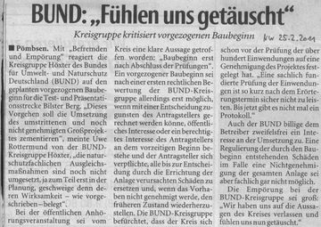 Naturschützer gegen TeststreckeNieheim (dm). Die drei Naturschutzverbände NABU, BUND und der LNU lehnen den Bau und Betrieb der Testrecke am Bilster Berg ab. Das machen die NRW-Landesverbände in ihrer Stellungnahme deutlich, die sie gestern beim Kreis Höxter eingereicht haben. Auf 17 dicht beschriebenen Seiten listen der Bund für Umwelt und Naturschutz Deutschland (BUND), die Landesgemeinschaft Naturschutz und Umwelt (LNU) und der Naturschutzbund Deutschland (NABU) ihre Gründe für die strikte Ablehnung des in der Bevölkerung nicht unumstrittenen 34 Millionen-Projektes auf. Die Verbände sehen Konflikte mit dem Artenschutz und mahnen die Unvereinbarkeit der Strecke auf dem Bilster Berg mit den Zielen des Naturparks Teutoburger Wald / Eggegebirge an. Zudem sehen die Naturschutzverbände in der Lärmbelastung eine schwerwiegende Beeinträchtigung und Schädigung von Natur und Landschaft. Das Vorhaben auf dem Bilster Berg sei unvereinbar mit den Zielen der Raumordnung und Landesplanung, schreiben die Verbände an den Kreis Höxter. Ferner mahnen sie an, das Lärmmedizinische Gutachten müsse überarbeitet werden. Sie fordern den Verzicht auf Sonderbetriebstage sowie die Anwendung der Immissionsrichtwerte für Kurorte. Und sie bemängeln, dass kein ausreichender Grundwasserschutz im Geländerparcours vorhanden sei. Quelle: Neue Westfälische vom 20. Januar 2011. |