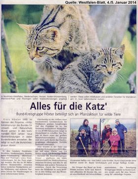 BUND Kreis HöxterBUND-Kreisgruppe Höxter beteiligt sich an Pflanzaktion für die Wildkatze in NiedersachsenIm Rahmen des Projekts "Wildkatzensprung" des Bundes für Umwelt- und Naturschutz Deutschland (BUND) werden in den kommenden fünf Jahren neue Waldverbindungen in den Bundesländern Nordrhein-Westfalen, Niedersachsen, Hessen, Baden-Württemberg, Rheinland-Pfalz und Thüringen entstehen. Die bis zu 50 Meter breiten Baumstreifen zwischen bisher isolierten Waldgebieten sollen Wildkatzen und anderen Tierarten Schutz für Wanderungen in neue Lebensräume bieten. Gleichzeitig ist der Aufbau einer bundesweiten Gendatenbank für Wildkatzen geplant. Langfristiges Ziel des Projektes ist, ein Netzwerk verbundener Waldgebiete von 20.000 Kilometern Länge in Deutschland zu schaffen. Das Projekt ist damit eines der größten Naturschutzvorhaben Europas und wird auch durch das Bundesprogramm „Biologische Vielfalt“ finanziell unterstützt.