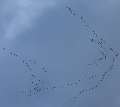 7.11.2004 13 bis 16 Uhr Kranichzug-Höhepunkt![]() Kraniche über Königstein Richtung Südwesten 14:45 ![]() Kraniche sammeln sich über der Kernstadt ![]() 14:50 ![]() 15:03: Die Kraniche finden ihre Flugrichtung Weitere Informationen zum Kranichzug und die Möglichkeit Meldungen direkt einzugeben unter Internationales Kranichnetzwerk / Internatonal Crane Network Kranichmeldungen Die Flugrouten der Kraniche findet man hier Vogelzug Herbst 2004![]() 10.10.04 Kraniche über Königstein, Sichtung Johanniswald, Flugrichtung Westen ![]() Kraniche in Formation Wir danken Frau K.S. aus Königstein für die Überlassung der Fotos! 10.10.2004: Tausende Kraniche überquerten heute Königstein von Nordosten nach Westen ziehend. Sie nutzten den Ostwind, um energiesparend innerhalb eines Tages die Estremadura in Spanien zu erreichen. Dort werden sie überwintern. Jedes Jahr ziehen sie auf seit Jahrtausenden bestehenden Routen über den Taunus Richtung Südwesten. Auf der Kranichzug-Seite können Sie die Flugrouten der Kraniche verfolgen. Bitte teilen Sie uns Ihre Beobachtungen mit. Wir veröffentlichen diese gerne auch mit Foto an dieser Stelle. Artikel in "Frankfurter Rundschau zum Kranichzug in Hessen: Graukraniche überqueren Hessen im Flug Bis zu 90 Prozent der Weltpopulation der Großvögel nimmt beim Zug ins Winterquartier die Route zwischen Kassel und Wiesbaden Seit dem Wochenende ist Hessen wieder das Transitland für den europäischen Kranich: Bereits am Sonntag überflogen rund 20 000 Kraniche Mittelhessen. Am Montag zählten die Ornithologen allein im Raum Marburg 19 500 Tiere auf ihrem Flug ins Winterquartier, und auch am Dienstag setzte sich der Zug fort. VON STEPHAN BÖRNECKE Frankfurt · 12. Oktober · Die Ornithologen schätzen, dass jedes Jahr auf dem Herbstzug 70 bis 90 Prozent der Weltpopulation von rund 120 000 Tieren des Graukranich (wissenschaftlich: Grus grus) über Hessen hinweg fliegen. Sie kommen aus den großen Brutgebieten in Skandinavien, dem Baltikum oder aus Mecklenburg-Vorpommern und Brandenburg. Tausende der Vögel rasten zunächst an der norddeutschen Ostseeküste. Die größten Sammelplätze vor dem Flug ins Winterquartier liegen in der Rügen-Bock-Region am vorpommerschen Bodden: Allein dort rasteten in den letzten Wochen rund 40 000 der 1,20 Meter großen Vögel, deren Flügel eine Spannweite von 2,20 Meter haben. Weitere Rast-Stationen befinden sich an der unteren Oder, an der Mecklenburgischen Seenplatte, im Rhinluch vor Berlin und im Havelländischem Luch sowie seit einigen Jahren auch in der Oberlausitz. Die Vögel fliegen nonstop dann auf einer Südwest-Route am Harz vorbei, ziehen auf breiter Front über den Großraum Kassel, passieren den Raum Marburg sowie die Täler von Schwalm und Fulda, überqueren Vogelsberg sowie Wetterau und verlassen Hessen in der Gegend von Wiesbaden-Mainz. Sind die Vögel bei schlechter Witterung gezwungen niedriger zu fliegen, kann sie die Route, die innerhalb eines maximal 300 Kilometer breiten Korridors liegt, verschieben. Dann orientieren sie sich stärker an den Tallagen und schwenken zum Beispiel im Raum Fulda ab, um durch das Kinzigtal weiter nach Südwesten zu fliegen. Bei solchen Zugrouten kann es auch passieren, dass die Vögel sogar Frankfurt überfliegen. In diesem Herbst allerdings verläuft der erste von zwei erwarteten großen Schüben erheblich nördlicher. Bis in den späten November hinein kann der Zug des europäischen Kranichs, eine von 15 Kranicharten auf der Erde, dauern. Ziele sind vor allem die Extremadura in Spanien, wo alljährlich mit bis zu 70 000 Kranichen die meisten dieser Zugvögel überwintern. Eine zweite große Gruppe von 20 000 Kranichen verbringt die kalte Jahreszeit in Südfrankreich. Nur kleinere Populationen fliegen nach Nordwestafrika, Portugal oder bleiben in nördlicheren Teilen Frankreichs. Noch 1970 wurde Marokko als wesentliches Überwinterungsgebiet angesehen. Änderungen in der Landnutzung durch verstärkten Mais- und Reisanbau, milde Winter und verbesserte Schutzbedingungen an den Rastplätzen führten zur Verlagerung der Überwinterung nach Norden. Inzwischen verbringen bereits etwa 8000 Kraniche den Winter am Lac du Der Chantecoq im Nordosten Frankreichs. Nur selten unterbrechen die Kraniche ihren Zug und rasten auch in Hessen. Im letzten Jahr machten, so der Geschäftsführer des hessischen Naturschutzbundes Nabu, Hartmut Mai, 4000 der Vögel im Amöneburger Becken Station. Sie blieben dort mehrere Tage und übernachteten entgegen ihrer sonstigen Gewohnheit nicht stehend in flachen Gewässern, sondern auf Ackerland. Anders verläuft die Rast, wenn die Kraniche zum Beispiel das Bingenheimer Ried als Schlafplatz aufsuchen: Dort können sie im Wasser stehen und sind so vor Füchsen sicher. Noch ungeklärt ist, ob Kraniche auf ihrem Zug Probleme mit Windrädern haben oder nicht. " Da haben wir großen Forschungsbedarf", sagt Naturschützer Mai. Immer wieder beobachtete Irritationen und Zugunterbrechnungen, so der Nabu-Fachmann, treten offenbar vor allem bei Schlechtwetterlagen auf. Dann räche sich auch, dass verschiedene der traditionellen Rastplätze, die auch von Kiebitzen oder Drosseln angesteuert werden, mit Windparks verbaut sind. Dazu zählt zum Beispiel die Vassbecker Hochfläche im Diemel-Gebiet in Nordhessen, wo 60 Windräder den Landeplatz für Großvögel praktisch blockieren." Zu den Auswirkungen von Mobilfunkstrahlung auf den Vogelzug s. auch: Argumente Film zur Gefahr des Vogelschlags im Luftverkehr |