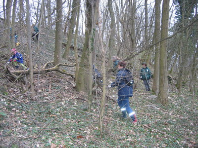 Ortsverband Königstein-GlashüttenMüllaktion der Stadt KönigsteinAn diesem Samstag hatte der Bürgermeister der Stadt Königstein, Leonhard Helm, dazu aufgerufen sich am Frühjahrsputz in Wald und Flur zu beteiligen.Unsere BUND-KInder waren mit großem Eifer dabei. Uns wurde der Bereich des Burgberghangs zugewiesen. "Da wird nicht so viel liegen, deswegen bekommt ihr jetzt weniger Müllsäcke" so die Meinung der Zuständigen. Alle Teilnehmer bekamen dicke Handschuhe, die später entsorgt werden sollten. Die "Ritter von Königstein" schlossen sich uns an und so machten wir uns zu Fuß auf den steilen Aufstieg zur Burg. ![]() Aufstieg zur Burg Schon an der Kleingartenanlage wurden die Säcke voll. ![]() Nach 90 Minuten schon volle Säcke Wir fanden Bauschutt, Terrakotta-Blumentöpfe, jede Menge Getränkeflaschen, Plastiktüten usw. Am Burghang mussten wir sehr vorsichtig sein, da der Hohle Lerchensporn schon in voller Blüte stand. ![]() Der Burghang war schon dicht mit blühendem hohlen Lerchensporn bewachsen Am Bolzplatz angekommen hatten wir keine Müllsäcke mehr. Eine "Rittersfrau" kaufte in Windeseile Nachschub und so konnten wir den eigentlichen Rundweg um die Burg in Angriff nehmen. ![]() Überreste von vergangenen Burgfesten: Nagelklötze!!! ![]() Noch ein Nagelklotz ![]() Entsorgte Stahlnägel - zu schwer zum Tragen Mit großem Entsetzen reagierten alle großen und kleinen Teilnehmer auf unseren merkwürdigsten Fund: Riesige verrottende Baumstämme, die mit sehr langen Stahlnägeln gespickt waren, wurden wohl in den vergangenen Jahren von der Burg herab geworfen. Die Kinder sammelten sehr viele Stahlnägel ein, die riesigen, relativ neuen Baumstämme konnten wir jedoch nicht bewältigen. Die Müllspuren vom alljährlichen Burgfest waren unübersehbar. Insgesamt sammelten wir 20 volle Müllsäcke. Bürgermeister Helm sicherte zu, dass die Stahlnägel-Altlasten entsorgt werden. Nach getaner Tat, wanderten wir zum Bauhof zurück, wo uns als Dank von der Stadt heiße Erbsensuppe und Getränke erwarteten. Es war ein interessanter und lustiger Tag zum Wohle unserer Umwelt! |