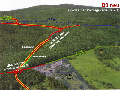 Fotomontage des B8-neu Verlaufs im südlichen Abschnitt![]() Montage: Nicole Höltermann Die geplante B8-West verläuft vierspurig in Verlängerung der heute vom Main-Taunus-Zentrum kommenden B8. Sie überquert das Liederbachtal vierspurig auf einer großen Brücke (s.u.) und verläuft weiterhin vierspurig westlich von Schneidhain in Sichtweite des Rodenbergs, Kohlwegs, Erdbeersteins u.a. Auf Höhe B455 fädelt sich die B8-neu mit Ampelanlagen und Zusatzspuren in die bestehende Straße ein, um mit 10% Steigung dreispurig Richtung Ölmühlweg zu verlaufen. Fotomontage des B8-neu Verlaufs im nördlichen Abschnitt![]() Montage: Nicole Höltermann Die geplante B8-neu verläuft 150 m westlich vom Kultur und Tagungszentrum der Dresdner Bank. An der Kreuzung mit dem Ölmühlweg ist eine autobahnähnliche Ausfahrt mit Überführung geplant. Dann steigt die B8-neu dreispurig rechts vom Steinkopf an der Nepomuk-Quelle, der Forellenzucht, dem Wasserwerk und das Stoltze-Plätzi entlang. Über dem Billtal erstreckt sich dann die dreispurige Billtalbrücke, der Anschluß an die alte B8 wird neu hergestellt, dafür müssen die Anglerteiche zugeschüttet werden. Die alte B8 wird auf einem kurzen Stück rückgebaut, am Eselsheck werden B8-neu und alt wieder aufeinandertreffen. Alle uns zugegangenen Akten zum ROV B8Nun auch online für jeden Interessenten:hier klicken - Sonderseite! Direkter Link zum Erläuterungsbericht: hier... Die sehr großen Anlagen können als CD-ROM bei uns kostenlos angefordert werden. Der Erläuterungsbericht ist NUR eine KURZFASSUNG der neun Ordner, die in den Rathäusern ausliegen! Besonders die Verkehrsuntersuchung, die genaue Methodik der Lärmberechnung und der Immissionsberechnung sind hier nicht enthalten! Wir danken unseren Freunden der "Eppsteiner gegen Fluglärm" insbesondere Horst Weise , für den großen Platz auf ihrem Riesen-Server. Flyer mit Mustereinwendung zum DownloadHier finden Sie unseren Flyer zum Ausdrucken und Weitergeben.Wir danken unseren Freunden von der HGON in Kelkheim und insbesondere Oliver Conz!