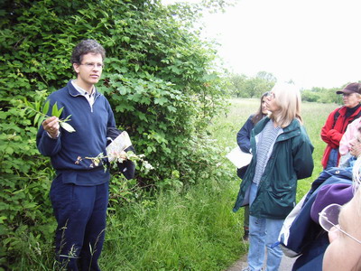 Ortsverband Königstein-GlashüttenMammolshain: Botanische Wanderung am Samstag 3. Juni 2006Wir danken Dietmar Hemmerle für alle Bilder der Wanderung in Mammolshain.18 Interessierte fanden sich am vergangenen Samstag am Mammolshainer Friedhof ein, um sich von Dr. Stefan Nawrath, Botaniker und Spezialist für Biodiversität (Artenvielfalt) an der Uni Frankfurt durch die Mammolshainer Streuobstwiesen und Felder führen zu lassen. Dr. Nawrath wies in seinen Begrüßungsworten darauf hin, dass der größte Schatz Mammolshains, die noch nach Hessischen Naturschutzgesetz geschützten Streuobstwiesen, bedroht sind: Durch die Novellierung des Gesetzes entfällt dieser Schutz. Auch Landschaftsschutzgebiete werden aufgelöst. Die Wanderung gliederte sich in fünf Etappen, die sich fast wie in einem Lehrbuch aneinanderreihten: 1. Überdüngte und artenarme Parzelle, Monokultur, Feldränder mit Neophyten 2. Gut gepflegte Streuobstwiesen mit Hochstämmen, typischer Unterbewuchs 3. Laubwald, von schweren Waldbewirtschftungsmaschinen stark in Mitleidenschaft gezogen 4. Gut gepflegte, nicht gedüngte nährstoffarme und daher sehr sehr artenreiche Wiese, die schützenswert ist. (Grumbachwiesen) 5. Brache oberhalb der schützenswerten Wiese, mit hohem Potential sich bei richtiger und behutsamer Pflege, in Richtung artenreiche Wiese zu entwickeln. 1. Am Wegrand unweit des Mammolshainer Friedhofs befindet sich eine Fläche, die früher möglicherweise stets als Ablageplatz für Mist oä genutzt wurde. Dieser Bereich ist überdüngt, dort wachsen nur Brennessel (fast monokulturartige Ausbreitung!) Stumpfblättriger Ampfer Heimischer Bärenklau Glatthafer Kriechender Hahnefuß Taumelkälberkropf (sieht ähnlich aus wie Wiesenkerbel) Auf dem Weg zum nächsten Abschnitt erläuterte Stefan Nawrath den Biotoptyp Gehölz: ![]() Biotoptyp Gehölz Ein brachliegendes Gelände rechts des Weges ist möglicherweise eine sog. Spekulationsbrache (Eigentümer lassen Grundstücke jahrzehntelang brachliegen und hoffen auf steigende Grundstückspreise). In der Zwischenzeit ist dort ein hochinteressanter Lebensraum entstanden ausgehend vom Streuobst: es wachsen dort Zwetschgen, Schlehen, Kastanien, es liegt viel Totholz. Für alle Arten von Lebewesen ist das ein gut strukturiertes und schützenswertes Biotop. Auffällig an der Mammolshainer Gemarkung ist die gut erhaltene Kleinstrukturierung, die die Arten- und Biotopvielfalt unterstützt. Diese Struktur sollte unbedingt beibehalten werden und nicht in sehr große Flächen überführt werden. 2. Biotoptyp Streuobtswiese: ![]() Neue Hochstammkultur ![]() Verschiedene Kleesorten, möglicherweise ausgesät Neben Hochstämmen, die gut gepflegt und locker in Reihen angepflanzt sind, konnten die Besucher den Speierling sehen. Darunter einen Bewuchs aus Weißklee und Wiesenklee, Gamander Ehrenpreis oder Männertreu(Veronica chamaedrys) sowie den Lolch (Lollium perenne). Am Wegrand fanden sich einige Brombeerhecken, die als strukturgebender Lebensraum auch für Vögel wichtig sind. Dazwischen fand sich jedoch ein Einwanderer oder Neophyt, der unbedingt bekämpft werden sollte. ![]() Ungebetener Gast: Heckenkirsche (Lonicera henriis) Die Heckenkirsche (Lonicera henriis)ist in den letzten Jahren aus Gärten ausgebrochen und droht sich unkontrolliert auszubreiten. Dieser erste in Mammolshain erfasste Bestand sollte radikal gemäht werden. Am gleichen Standort fand sich die Robinie, ein ebenfalls von Botanikern nicht gern gesehener Neophyt. Kurz vor dem Waldbereich fand sich ein größerer Bestand eines Neophyten, der den Botanikern große Sorgen bereitet: ![]() Der Japanknöterich Der Japanische Staudenknöterich - er läßt sich kaum bekämpfen, erobert aber sehr schnell weite Flächen auch in Wäldern und verdrängt heimische Arten. 3. Im Laubwald, in dem Kastanien, Eichen und Buchen dominierten, waren frische Schäden von modernen Waldbewirtschaftungsmaschinen zu sehen. ![]() Nach den Baumfällungen... ![]() ..verdichteter Waldboden und kaum alte Bäume übrig Aus Sicht des Naturschutzes sind alte und tote Bäume die interessantesten Biotope. Gerade diese werden heutzutage beim "Aufräumen" in Wäldern heraustransportiert. Früher bemühte man sich um die nachhaltige Bewirtschaftung des Waldes. Diese war personalintensiv und zeitaufwändig. Da der Forstbetrieb heute nur unter Wirtschaftlichkeitsaspekten betrieben wird, werden schwere Maschinen eingesetzt, die eine hohe Verdichtung des Waldbodens mit sich bringen und das Nachwachsen der nächsten Schößlinggenerationen gefährden. Breite Schneisen zeugen von der kürzlichen Tätigkeit der Holzfäller. Auf dem Weg zu den Grumbachwiesen beschrieb Dr. Nawrath noch eine typische Pflanzengesellschaft des Wegrandes, in der folgende Pflanzen wachsen: Zypressenwolfsmilch Mausohr Habichtskraut (dreht seine Blätter in der Hitze um, um die Verdunstung zu verringern) Kleiner Klappertopf (Wasserschmarotzer) Grasstermiere Rohrglanzgras Die "Spuren des weißen Mannes" wie die Indianer die breiten Blätter des breiten Wegerichs nennen, werden so genannt, weil ihre Samen klebrig sind und deshalb an Schuhsohlen kleben bleiben. So folgt diese Pflanze den Wanderwegen des Menschen. Ein Halbstammobstbaumbestand auf dem Weg zeigte die Struktur einer eher intenisven und erwerbsorientierten Bewirtschaftung, die nicht naturschutzgerecht ist. 4. Die Grumbachwiesen ![]() Die Grumbachwiesen, ein schützenswerter Bereich ![]() Kuckuckslichtnelke Die Grumbachwiesen sind möglicherweise seit vielen Jahrhunderten nur extensiv und ohne Düngung bewirtschaftet worden. Davon zeugt ihre große Artenvielfalt, die unbedingt schützenswert erscheint. Da im Taunus die Pferdehaltung floriert, ist dies ein Glück für die Erhaltung solcher mageren Wiesen: Pferde brauchen spät gemähtes Heu. Die Artenliste: Großer Wiesenknopf (im Zusammenhang mit seiner Wirtsart dem Ameisenbläuling - FFH-Art!) Kammgras Wiesenschwingel (Festuca rubra) Wiesenfuchsschwanz Wirthgens Labkraut H