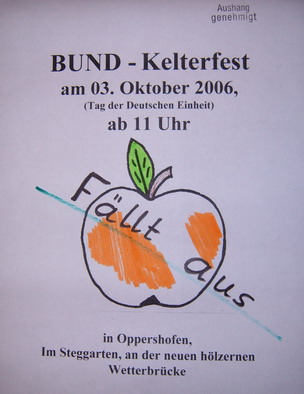 Ortsverband Rockenberg03. Oktober 2006KelterfestOrt der Veranstaltung ist Oppershofen. Beginn wird um 11.00 Uhr sein.Helfer finden sich ab 9.00 Uhr ein. Die Gemeinde hat uns eine ihrer Flächen an der neuen (Fußgänger-) Wetterbrücke (Im Steggarten) zur Verfügung gestellt. Diese Fläche liegt an der Apfelweinroute. Hinweisschilder werden an der Hauptstraße aufgestellt. ![]() ... in's Wasser gefallen ... Trotzdem hatten die Mitglieder die Möglichkeit Most zu beziehen. Mehr hierzu unter Kelterei "Rote-Pumpe" |